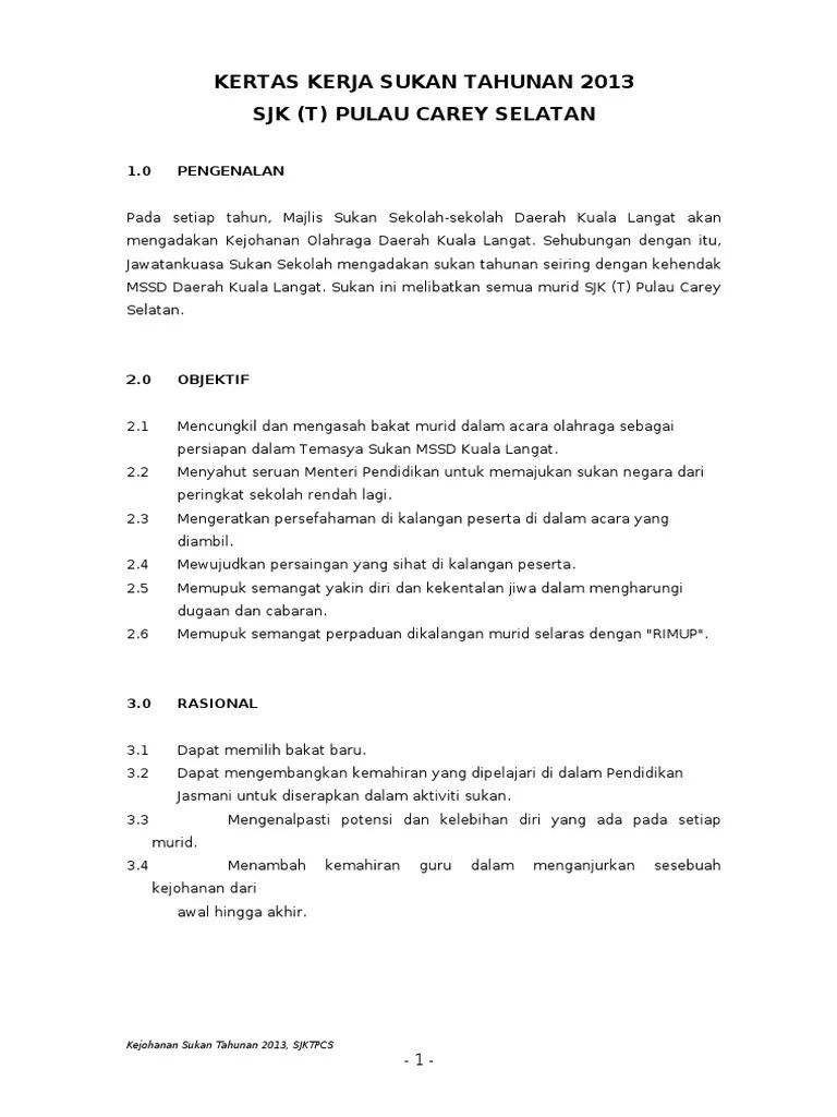 Kejohanan ini dirancang bagi mengisi program kokurikulum sekolah . Panduan dan contoh kertas kerja sukan tahunan peringkat sekolah rendah untuk bahan rujukan kertas cadangan kejohanan balapan padang tarikh masa tempat. Baca versi flipbook dari kertas kerja sukan tahunan padang dan. Temasya sukan tahunan adalah satu program rasmi sekolah yang dirancang dan dilaksanakan pada setiap tahun. Kejohanan olahraga tahunan sk jalan gurney (1)bil.kandunganmuka surat1tajuk22tarikh / masa / tempat23kumpulan sasaran24objektif25kpi .